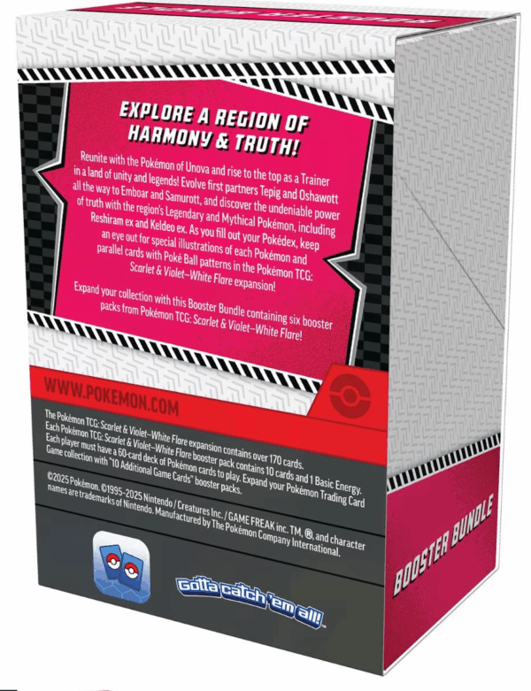 Reunite with the Pokémon of Unova and rise to the top as a Trainer in a land of unity and legends! Evolve first partners Tepig and Oshawott all the way to Emboar and Samurott, and discover the undeniable power of truth with the region’s Legendary and Mythical Pokémon, including Reshiram ex and Keldeo ex. As you fill out your Pokédex, keep an eye out for special illustrations of each Pokémon and parallel cards with Poké Ball patterns in the Pokémon TCG: Scarlet & Violet—White Flare expansion!