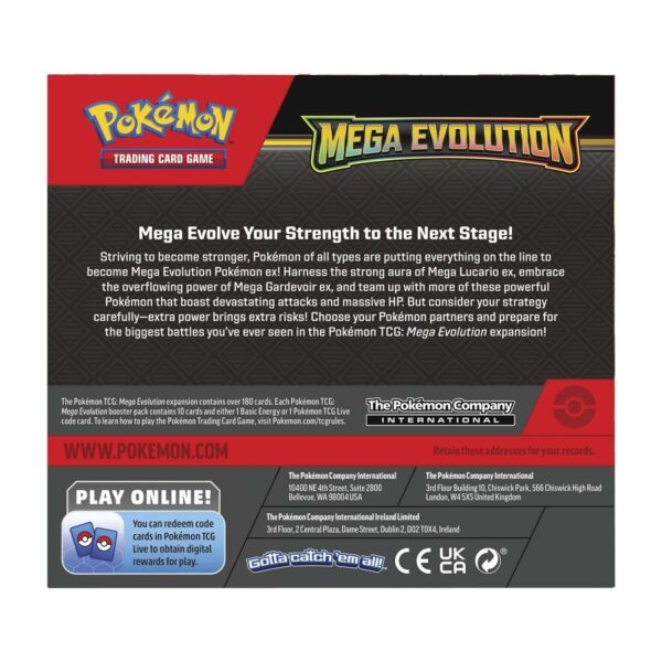 Striving to become stronger, Pokémon of all types are putting everything on the line to become Mega Evolution Pokémon ex! Harness the strong aura of Mega Lucario ex, embrace the overflowing power of Mega Gardevoir ex, and team up with more of these powerful Pokémon that boast devastating attacks and massive HP. But consider your strategy carefully—extra power brings extra risks! Choose your Pokémon partners and prepare for the biggest battles you’ve ever seen in the Pokémon TCG: Mega Evolution expansion!
