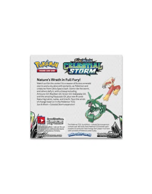 At the heart of the Celestial Storm expansion is Rayquaza-GX, the legendary Dragon-type Pokémon with immense power. Alongside fan-favorites like Articuno-GX, Blaziken-GX, and Stakataka-GX, this set brings high-energy gameplay and stunning card designs to your Pokémon TCG battles.